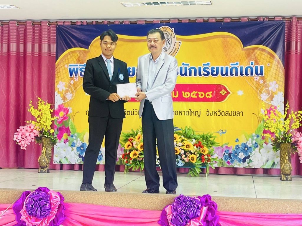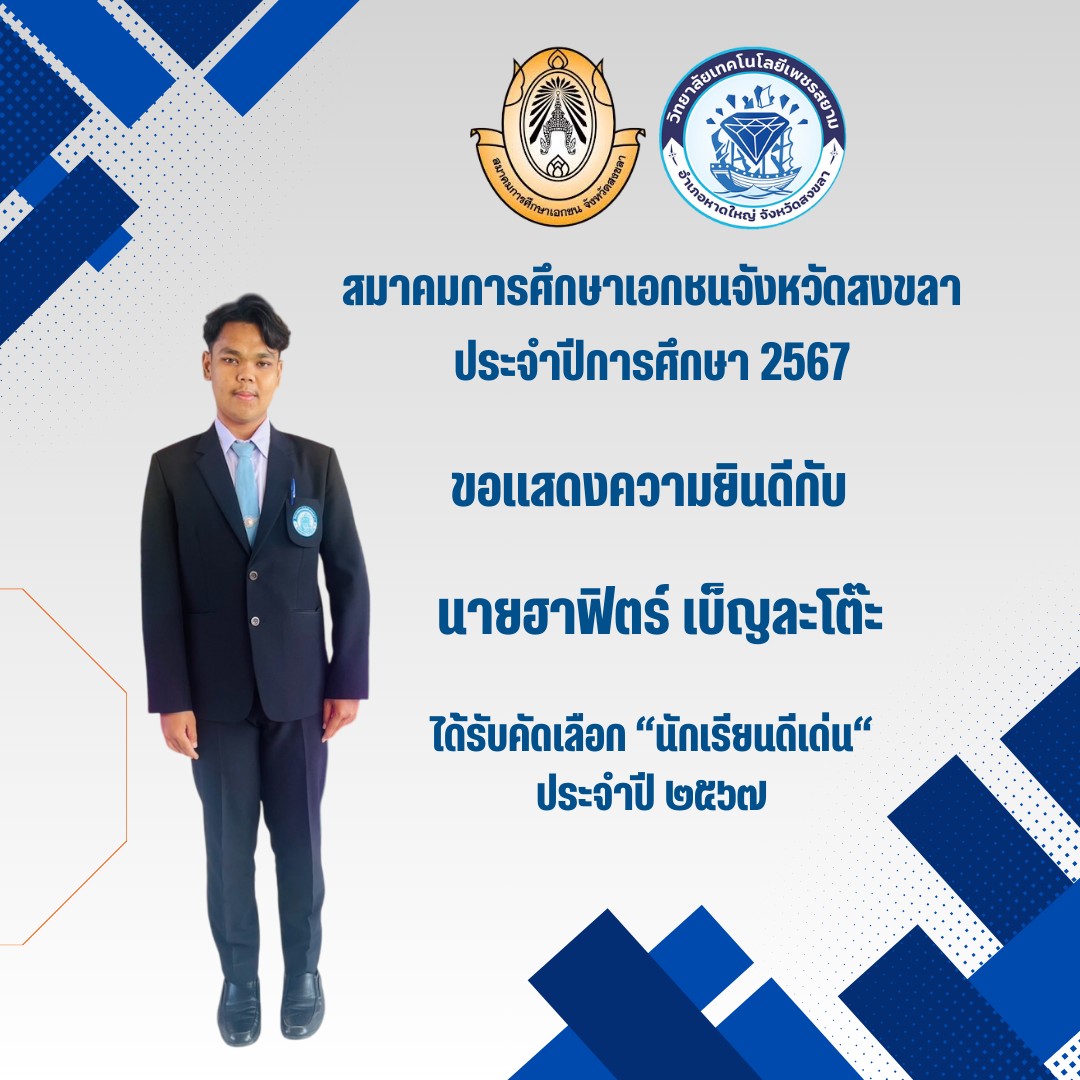 วิทยาลัยเทคโนโลยีเพชรสยาม ขอเเสดงความยินดีกับ นายฮาฟิตร์ เบ็ญละโต๊ะ นักศึกษาระดับประกาศนียบัตรวิชาชีพชั้นสูงปีที่ 1 สาขาการบัญชี ที่ได้รับรางวัลนักเรียนดีเด่น ของสมาคมการศึกษาเอกชนจังหวัดสงขลา
